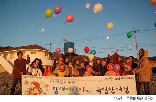 푸르메재단은 2008년 한해를 마무리하고 새해를 맞이하기 위해 박씨와 장애청소년 13명이 오는 29일 경남 거제도를 찾을 예정이라고 23일 밝혔다. 이번 여행은 지난 9월 국내 최초로 청각장애와 시각장애, 지체장애, 발달장애를 가진 청소년들이 책을 만들고 출판까지 했던 ‘동화책 만들기 프로젝트’의 졸업여행을 겸하는 자리로 마련됐다. 1박2일 일정의 여행은 남해의 일몰과 일출을 바라보며 소원을 비는 새해맞이 행사와 한국인의 애송시 ‘깃발’로 유명한 청마 유치환 선생의 생가방문 등 다양한 프로그램으로 진행된다. 또한 이번 여행에서는 2000년 교통사고로 중화상을 입고 수 차례 수술을 받은 뒤 ‘지선아 사랑해’라는 수기로 유명해진 이지선씨도 동참해 ‘나의 청소년 시절’이란 주제로 강연할 예정이다. 재단 관계자는 “소설가를 꿈꾸는 장애청소년들에게 더 없이 좋은 시간이 될 것으로 기대된다”며 “아직도 선뜻 밖으로 나오지 못하는 수많은 장애인에게도 다가오는 새해의 꿈과 희망이 되길 바란다”고 말했다. 국민일보 쿠키뉴스 김아진 기자 ahjin82@kmib.co.kr
