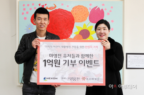 아시아투데이 김종훈 기자 = ㈜넥슨(대표 서민)은 26일 자사의 인기 액션 RPG ‘마비노기 영웅전’(이하 마영전) 4주년을 기념해 진행한 ‘착한 기부’ 이벤트를 통해 조성한 유저 기부금 1억 원을 푸르메재단이 마포구 상암동에 짓는 ‘어린이재활병원’ 건립 기금으로 전달했다.