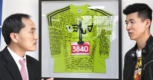 그가 홍보대사로 있는 푸르메재단 사무실 입구에는 마라톤 셔츠가 걸려 있다. 그 셔츠에는 사람들 이름이 빡빡하게 적혀 있다. 후원자 365명의 이름이라고 했다.