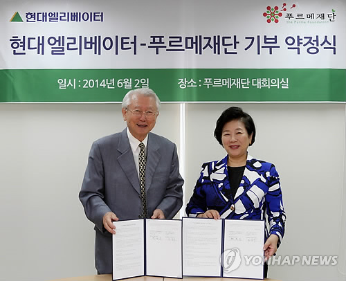 현대엘리베이터는 이날 서울 신교동 푸르메재활센터에서 푸르메재단과 기부 약정을 체결했다. 약정식에는 현정은 현대그룹 회장이 참석해 행사 후 센터 시설을 둘러보고 어린이 환자들에게 교육용 완구를 선물했다.