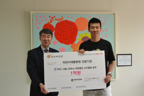 아시아투데이 문연배 기자 = '선행천사' 션이 자전거로 국토 종단 후 1억 430만원을 어린이 재활병원 건립을 위한 기금으로 써달라며 푸르메 재단에 기부했다.
