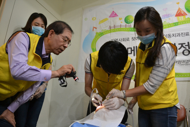 박원순(왼쪽) 시장이 치과 진료를 돕고 있다.