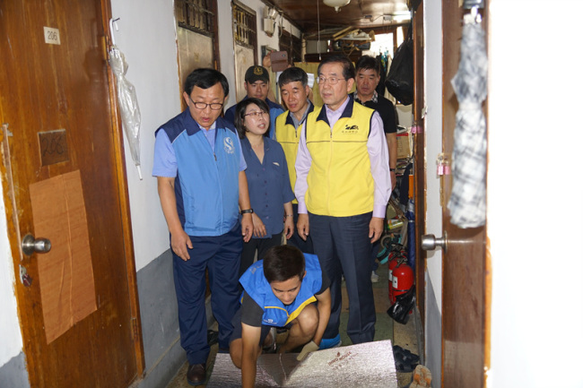 박원순 (오른쪽 두 번째)시장이 쪽방촌에서 봉사자들과 함께 도배를 하기에 앞서 설명을 듣고 있다.