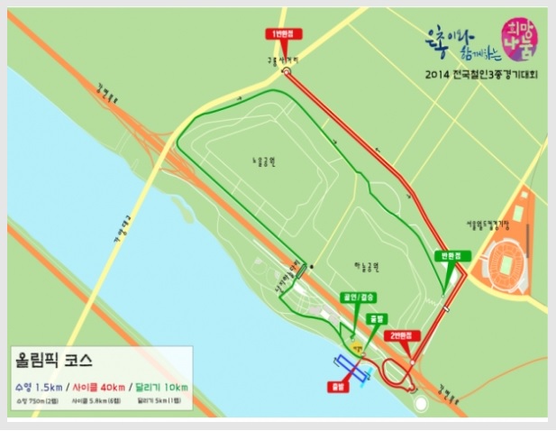 ▲한강공원 난지지구 요트장 일대에서 펼쳐지는 1.5㎞의 수영코스를 시작으로 ▲한강공원 난지지구~서울월드컵경기장 사거리~구룡사거리를 돌아오는 40㎞의 사이클코스 ▲한강공원 난지지구~난지하늘다리~노을공원 난지순환길~난지천공원길~주차장을 기점으로 반환하는 10㎞의 달리기코스로 진행된다.