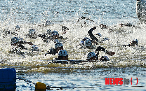 【서울=뉴시스】박동욱 기자 = 14일 오전 서울 마포구 난지한강공원에서 열린 '은총이와 함께하는 전국 철인 3종 경기대회'에서 참가자들이 힘차게 출발하고 있다.