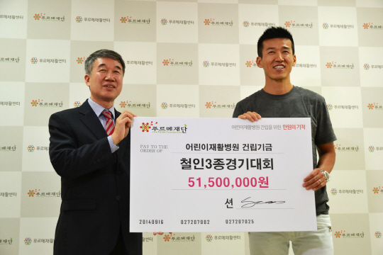 션이 또 한번 사랑을 실천했다. 션은 16일 종로구 신교동 푸르메재단에서 어린이재활병원 건립 기금 5150만 원을 기부했다고 푸르메재단(이사장 김성수, 공동대표 이정식)이 밝혔다. 한땀 한땀 정성으로 마련한 돈. 지난 14일 마포구에서 열린 '제2회 은총이와 함께하는 철인3종경기대회'를 완주한 기념으로 나눔을 실천했다. 수영 1.5km, 사이클 40km, 마라톤 10km를 3시간2분 대의 우수한 성적으로 완주했다. 달린 거리 1m 당 1000원에 해당하는 금액을 기부했다.