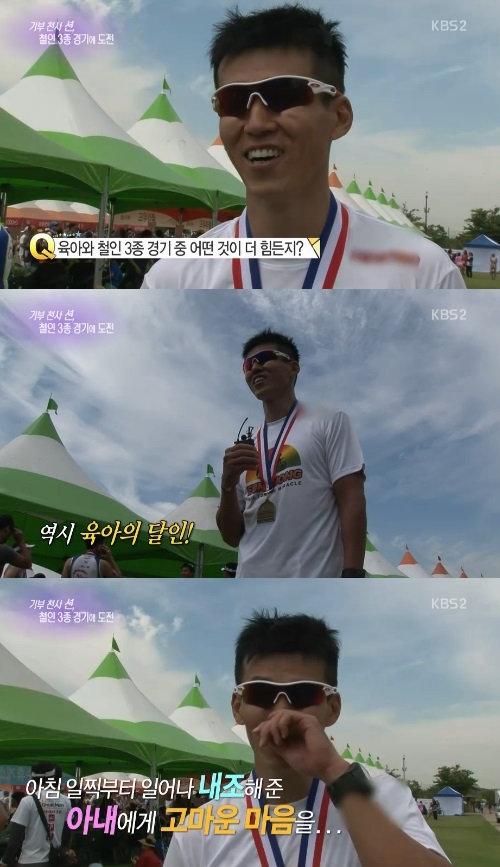 정혜영 남편 션은 "희귀 난치병을 갖고 있는 은총이라는 친구가 있다. 그 아이의 건강을 위해 은총이 아버지가 철인 3종 경기에 출전 하시는데 은총이와 아버지에게 힘이 돼 드리고자 함께 출전하게 됐다"고 말했다.