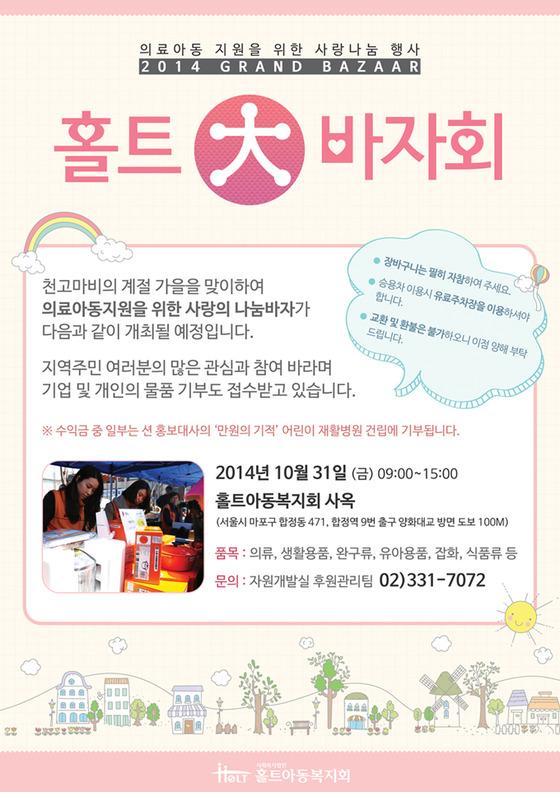 홀트아동복지회는 의료아동 지원을 위한 바자회를 오는 31일 오전 9시부터 오후 3시까지 서울 마포구 합정동 홀트아동복지회 본부에서 개최한다고 28일 밝혔다.