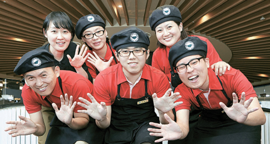 효성ITX에서 운영하는 행복두드리미의 장애인 직원이 카페에서 일하면서 활짝 웃고 있다. 효성은 매년 두 차례 헌혈 행사를 통해 백혈병·소아암 어린이도 돕고 있다. [사진 효성]