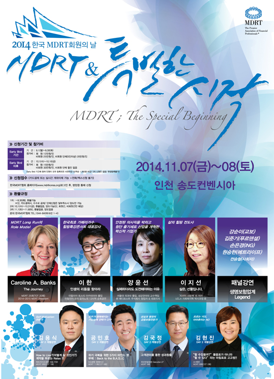 “MDRT& 특별한 시작, MDRT; The Special Beginning”이라는 슬로건으로 진행될 이번 행사에는 MDRT회원, 더불어 MDRT를 목표로 하는 생명보험설계사가 참석하며 국내 생명보험사의 임원진, MDRT본부와 일본MDRT챕터의 VIP를 초청하여 한자리에 모여 펼쳐지는 화합과 교류의 장이 될 예정이다.