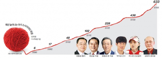 박지성 전 국가대표팀 축구선수, 프로골퍼 최나연, 류중일 삼성 라이온즈 감독, 영화배우 수애 등 스포츠·방송 스타도 11명이다. 넉넉하지 않은 살림에 고액을 기부한 경우도 있다. 한성대에서 건물 경비원으로 일하는 김방락 씨(67)는 최근 “경비원 직업을 가진 사람도 사회에 기여할 수 있다는 걸 보여주고 싶었다”며 1억원을 약정해 화제가 됐다.