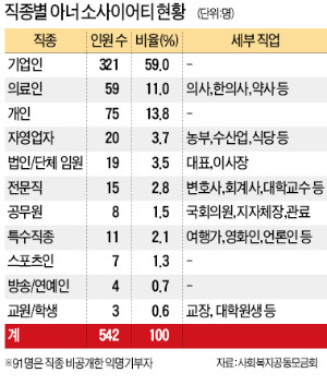 633명의 아너 소사이어티 회원 중 익명기부자 91명을 제외한 542명 중에선 최신원 SKC 회장 등 기업인이 321명(59.0%)으로 가장 많다. 정치인·공무원은 총 7명이다. 정홍원 국무총리는 지난해 2월 가입했다. 현직 국회의원은 새누리당의 박상은 의원(인천 중·동구·옹진군)과 정갑윤 국회부의장(새누리당·울산 중구) 등 두 명뿐이다. 정몽준 전 새누리당 의원은 지난해 12월 20억원을 기부해 아너 소사이어티에 가입했다. 신고 재산 6억7000만원으로, 제19대 국회의원 평균 재산(18억6800만원)의 3분의 1 수준인 정 부의장은 “정치인들이 기부에 적극 나서야 한다”고 강조한다.