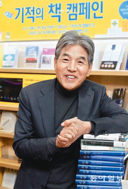 지난달 26일 박범신 소설가가 서울 광화문 교보문고에서 어린이재활병원 모금 프로젝트 ‘기적의 책 캠페인’ 서가 앞에 섰다. 그는 “여러 사람이 기부하는 방식으로 병원을 짓는다면 벽돌 하나하나에 많은 기부자의 정성이 깃들어 더없이 튼튼한 병원이 될 것”이라며 참여를 독려했다. 김경제 기자 kjk5873@donga.com3