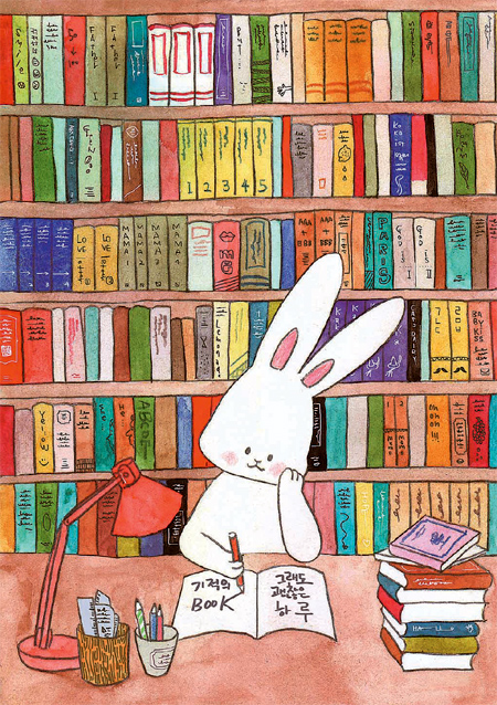 구경선 작가가 ‘기적의 책 캠페인’을 응원하며 그려 온 그림. 귀가 큰 토끼 ‘베니’가 구 작가의 책 제목 ‘그래도 괜찮은 하루’와 ‘기적의 BOOK’을 쓰고 있다.