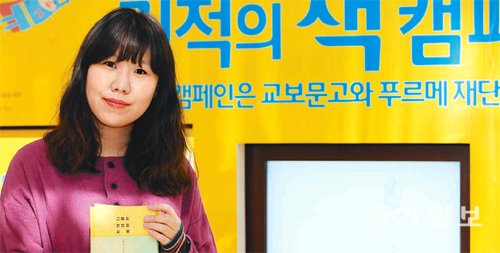 지난달 31일 서울 종로구 교보문고 기적의 책 판매대에서 만난 구경선 작가. 구 작가는 자신의 책 ‘그래도 괜찮은 하루’가 기적의 책에 선정되자 “제 책이 남을 돕는 일에 사용되니 무척 기쁘고 감사하다”고 했다. 김경제 기자 kjk5873@donga.com
