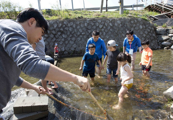 이는 효성이 지난해 7월 장애인 의료재활 전문기관 ‘푸르메재단’과 함께 준비한 재활치료 프로그램의 일환이다. 임직원 여덟 가족과 장애아동·청소년 여덟 가족 52명이 2가족 1조로 일대일로 매치돼 1박2일 동안 인절미·손수건 만들기, 송어잡이 등을 체험했다.