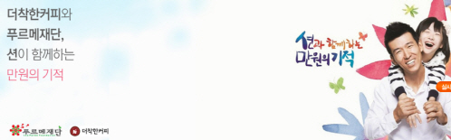 커피전문점 ‘더착한커피’는 장애인 지원 전문단체 푸르메 재단, 가수 션과 손잡고 어린이 재활병원건립을 위해 365일 기부하는 ‘만원의 기적’ 행사를 벌이고 있다. 매달 전국 100여개 가맹 점주의 이름으로 만원씩 기부하는 행사다. 기부금은 점주에게 강요하지 않고 본사 스마트플레이스에서 전액 부담한다.