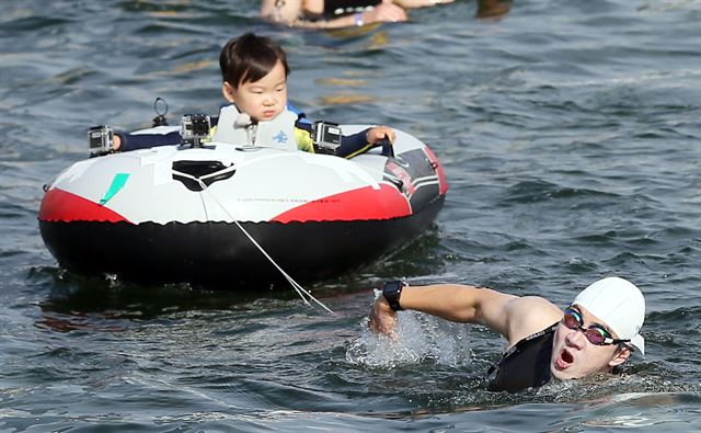 배우 송일국과 아들 대한이가 지난 17일 오전 인천시 연수구 송도센트럴공원에서 열린 '제3회 국민안전처 장관배 전국 트라이애슬론 대회'에서 힘차게 물길을 질주하고 있다. 연합뉴스