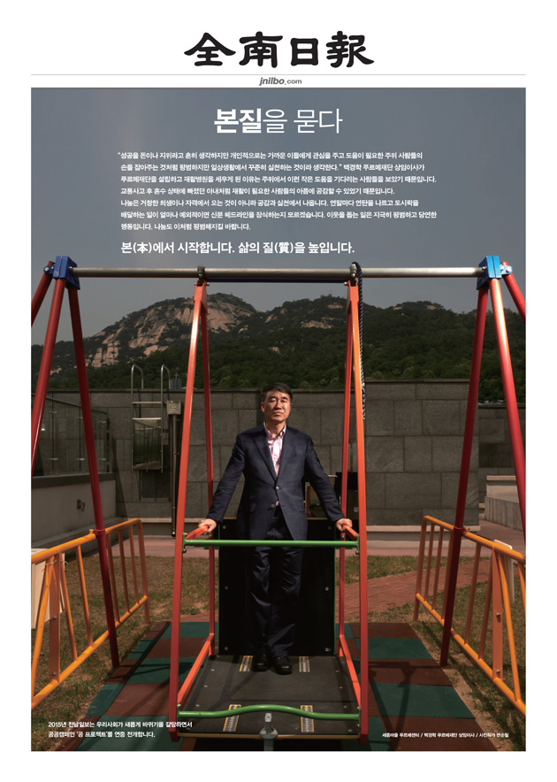 이에 따라 우리 사회의 문제점과 희망 찾기를 인물을 통해 조망해오고 있는 전남일보 공프로젝트는 '노블레스 오블리주'를 6월 주제로 정했다. 각계 전문가가 재능 기부형태로 프로젝트팀에 참여하는데 팀에서 선정한 인물은 백경학(52)푸르메재단 상임이사다. 그는 아내의 교통 사고를 계기로 국내 최초의 환자 중심의 장애인 어린이 재활병원 설립을 위해 맥주제조회사를 만들고 그 수익금 일부를 기금으로 해 비영리법인 푸르메 재단을 설립해 10년여간 매진해온 인물이다. 백 상임이사는 정부가 해야 할 일을 대신해 시민과 기업, 지자체의 기부를 이끌어냄으로써 공공의 가치 실현에 앞장서왔다. 포기하지 않고 제때 제대로 된 재활 치료를 받는다면 장애와 가난이라는 이중고통을 받는 장애어린이들에게 새로운 삶을 열어줄 수 있다는 확고한 신념을 갖고 있어서다.