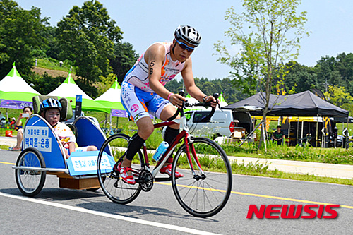 【서울=뉴시스】지난 2013년 은총이의 이름을 딴 전국철인3종경기대회에서 은총이 아빠 박지훈 씨가 은총이를 트레일러에 태우고 질주하고 있다. (사진 = 푸르메재단 제공) 2015.07.30. photo@newsis.com 2015-07-30