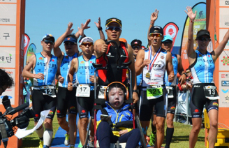 푸르메재단 홍보대사 션과 은총 부자가 철인들과 함께 완주의 기쁨을 만끽하고 있다.