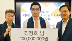 보육원에서 성장한 30대 자산관리사가 어린이 재활병원 건립기금으로 1억원을 기부했다. 푸르메재단과 사회복지공동모금회에 따르면 종합자산관리사 김정호(37·사진 가운데)씨는 24일 서울 중구 정동 사회복지공동모금회 사랑의열매 회관에서 푸르메재단에 1억원을 전달했다. 이 돈은 국내 첫 통합형 어린이재활병원으로 2016년 문을 열 예정인 ‘푸르메재단 넥슨어린이재활병원’을 짓는데 쓰인다.