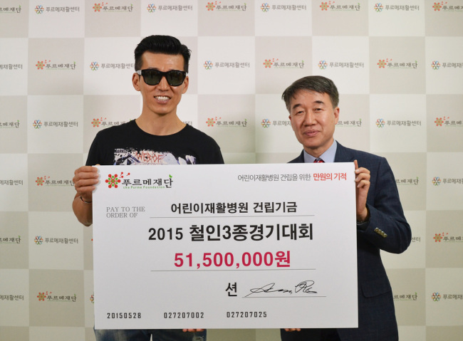 가수 션이 지난 5월 철인3종 경기 완주 기념으로 어린이 재활병원 건립에 5150만원 기부하고 있다.