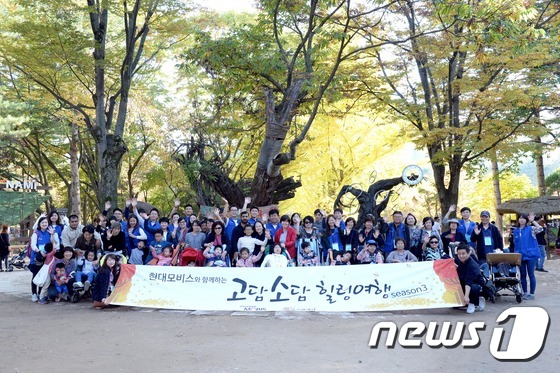 현대모비스가 신체활동이 어려운 장애아동들을 위해 실시한 1박2일 힐링여행에서 참가 장애아동들과 그 가족들이 여행을 기념하는 사진을 촬영하고 있다.(사지제공=현대모비스)© News1