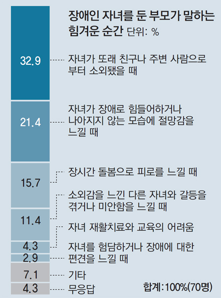 부모들이 가장 힘겨워할 때는 자녀가 다른 아이들과 어울리지 못해 소외감을 느낄 때였다. 23명(32.9%)이 이때 가장 힘들다고 답했다. 지적장애 2급 자녀(9)를 둔 엄마(42)는 “아이가 친구를 보고 반갑게 인사하고 싶어하는데 정작 그 아이는 모르는 사람 대하듯 외면할 때 하늘이 무너지는 것 같다”고 경험담을 털어놓았다.