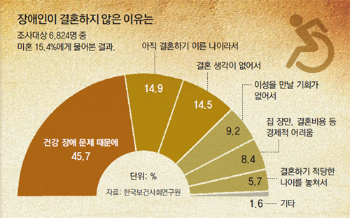 반면 경제력이 뒷받침되지 않는 부모에게 장애인 자녀의 결혼은 큰 부담이다. 장애인 결혼을 주선하는 성민복지관의 김용지 사회복지사는 “장애인 자녀를 돌보는 것만으로도 힘이 드는데 새로 들어오는 가족에다가 손자, 손녀까지 부양하는 것은 엄청난 짐”이라며 “홀로 지내는 자녀를 보면 눈물겹지만 되도록 결혼은 하지 않길 바라는 부모도 적지 않다”고 말했다.