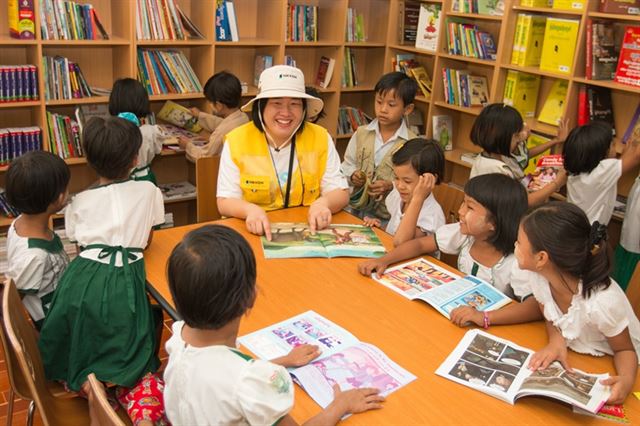 ▲넥슨이 지난해 미얀마 쉐비다 지역에 건립한 해외책방 4호점에서 어린이들이 책을 읽고 있다. [넥슨 제공]