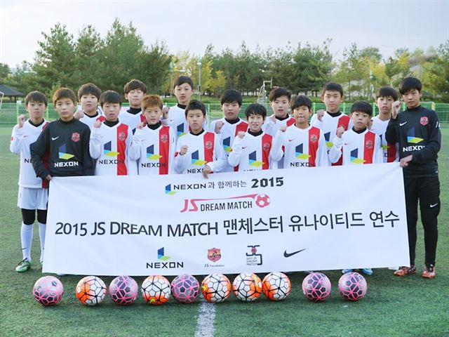▲넥슨이 후원하는 '2015 JS 드림컴'에서 우승을 차지한 유소년 축구팀 '김포JIJ팀'이 지난달 잉글랜드 맨체스터 유나이티드에서 일주일 간 연수 기회를 가졌다. [넥슨 제공]