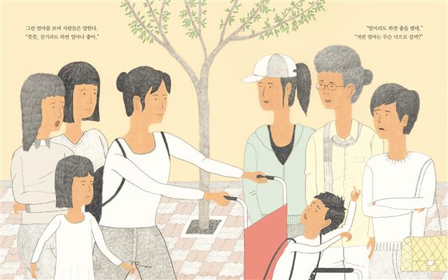 동생 찬이는 뇌병변 장애아다. 혼자서 할 수 있는 게 거의 없다. 걷지도 서지도 못한다. 밥 먹고 대소변을 가리기 또한 ‘큰일’이다. “엄마”라는 말조차 못하고 ‘으으으’ ‘아아아’ 라는 외마디 소리만 뱉을 뿐이다. 무엇보다 찬이와 찬이 가족이 넘어야 할 더 큰 장애물은 세상의 편견이다. “쟤가 네 동생이야?” “왜 학교 안 다니는데?” “목이 왜 저래”…, 그림책의 표지를 열면 장애인 가족을 대하는 우리 안의 무심한 시선과 질문이 ‘세상의 찬이들’에게 생채기를 낸다.