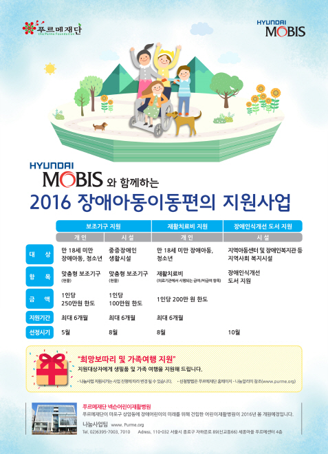 푸르메재단(이사장 강지원)과 현대모비스(대표이사 정명철)는 장애어린이와 청소년의 편리한 이동을 보장하기 위해 ‘현대모비스와 함께하는 2016 장애아동 이동편의 지원사업’의 신청자를 모집한다고 30일 밝혔다.