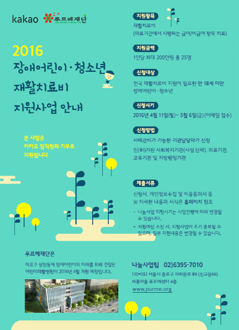 [이데일리 박경훈 기자] 푸르메재단(이사장 강지원)은 카카오(대표 임지훈)와 함께 장애어린이와 청소년에게 재활치료의 기회를 제공하기 위한 ‘카카오와 함께하는 2016 장애어린이·청소년 재활치료비 지원사업’ 신청자를 모집한다고 7일 밝혔다.