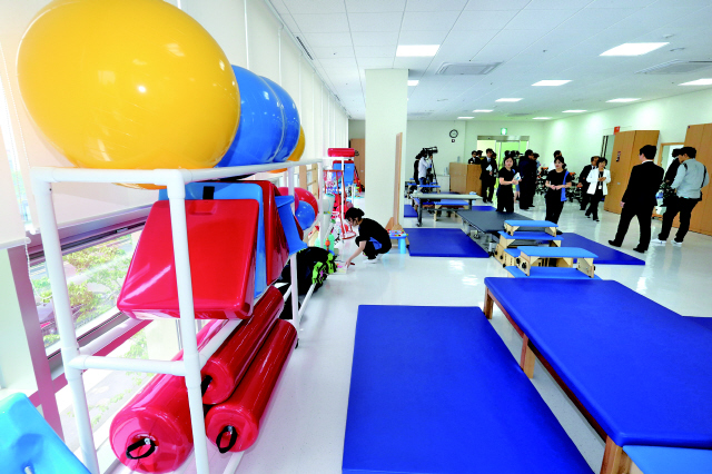 푸르메재단 넥슨어린이재활병원이 문을 연 28일 오전 서울 마포구 상암동 병원에서 개원식 참석자들이 작업치료실을 둘러보고 있다. 어린이재활병원은 의사, 간호사 등 100여명의 전문인력과 재활의학과, 소아청소년과, 정신건강의학과, 치과 등 진료과목, 물리·작업·언어·인지치료 등의 재활치료실을 갖추고 있다.
