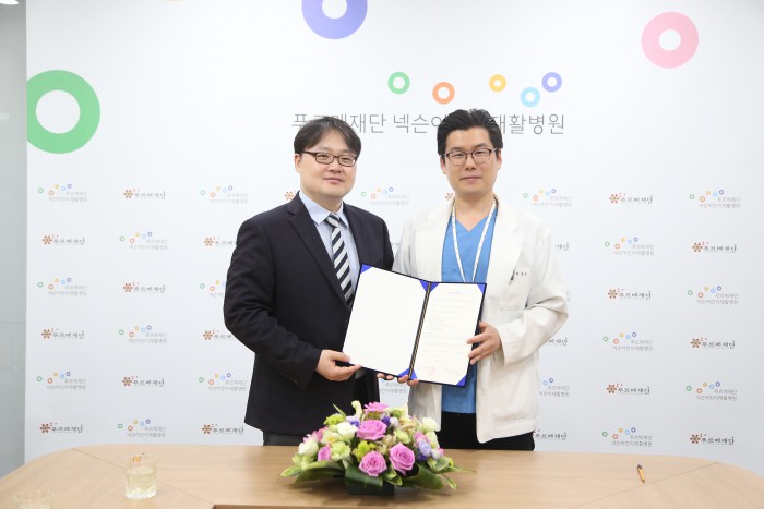 숙명여자대학교 신동식 화공생명공학부 교수(사진 왼쪽)와 푸르메재단 넥슨어린이재활병원 백한승 치과원장이 3일 재활병원 대회의실에서 협약을 맺은 뒤 기념사진을 찍고 있다. <사진제공=숙명여자대학교>