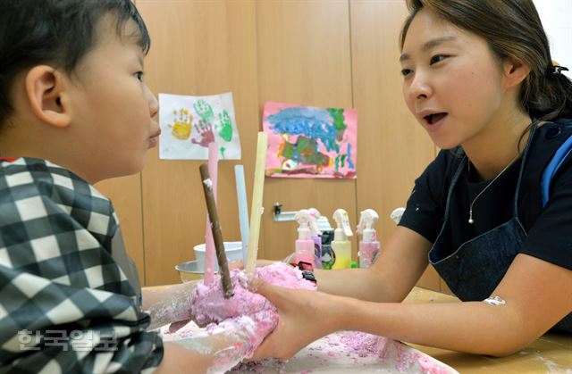 지적 장애 2급 판정을 받은 민호(5ㆍ가명)가 지난 26일 서울 마포구 상암동 푸르메재단넥슨어린이병원에서 전지혜 미술치료사에게 양 손을 원활하게 사용할 수 있도록 돕는 미술치료를 받고 있다. 서재훈 기자 spring@hankookilbo.com