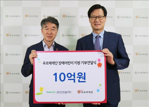 푸르메재단은 서울 상암동 푸르메재단 넥슨어린이재활병원 시공사 강산건설이 장애인 재활과 자립에 써 달라며 복지사업 기금 10억원을 전달했다고 15일 밝혔다.