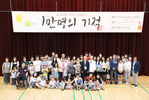 푸르메재단이 지난 4일 서울 마포구 상암동 푸르메재단 넥슨어린이재활병원에서 개최한 ‘1만 명의 기적’ 행사에서 어린이재활병원 건립에 함께 한 기부자들이 기념촬영을 하고 있다. 푸르메재단 제공