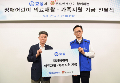 아시아투데이 최현민 기자 = 효성이 27일 의료재활 전문기관인 푸르메재단에 저소득층 장애어린이·청소년 의료재활 및 가족 지원기금 8000만원을 전달했다고 28일 밝혔다.