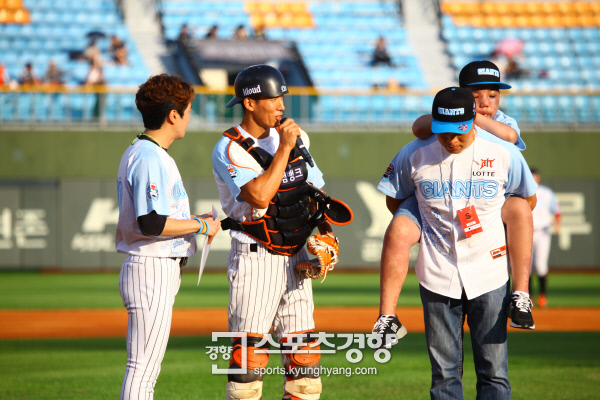 롯데 자이언츠와 게임업체 넥슨은 9일 부산 사직구장에서 열린 LG 트윈스와의 홈경기에서 뜻깊은 시구 행사를 마련해 팬들의 뜨거운 박수를 받았다.