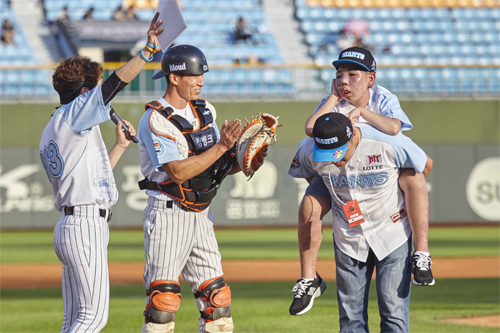 9일 롯데 자이언츠와 LG트윈스 경기가 열린 부산 사직야구장. 경기 시작 전 아이를 업은 아버지가 마운드로 걸어 들어왔다. 등에 업힌 아이는 뇌병변 장애로 온 몸을 제대로 움직이지 못하지만 아버지 박지훈 씨와 함께 마라톤, 철인3종 경기에 참가해 온 박은총 군(14).