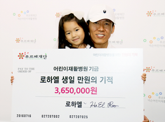 [이데일리 고준혁 기자] 푸르메재단(이사장 강지원)은 가수 션(44·본명 노승환)씨가 막내 딸 노하엘 양의 만 5세 생일을 기념해 장애어린이의 재활치료와 사회복귀를 돕는 ‘푸르메재단 넥슨어린이재활병원’에 365만원을 기부했다고 15일 밝혔다.