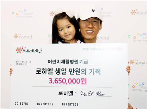 (서울=연합뉴스) 권영전 기자 = 푸르메재단은 가수이자 재단 홍보대사인 션이 딸 노하엘 양의 만 5세 생일을 맞아 재단이 운영하는 어린이재활병원에 365만원을 기부했다고 15일 밝혔다.