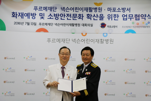 푸르메재단 넥슨어린이재활병원은 지난 13일 서울 마포소방서와 긴급 어린이 이송과 소방공무원의 정서장애 프로그램 지원에 대한 업무협약을 체결했다고 밝혔다.