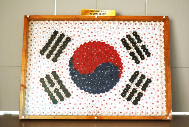 [사진=한통복 작가가 한지 무궁화로 만든 작품 ‘태극기’(푸르메재단 제공) ]