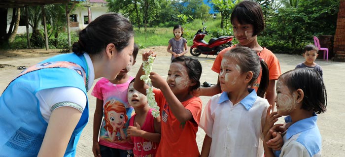 미얀마 양곤 떼귄 마을에 도착한 한국 의료진에게 아이들이 재스민 화환을 걸어주고 있다. 미얀마에서 재스민은 ‘순수한 마음을 담아서’라는 뜻을 가지고 있다. /푸르메재단