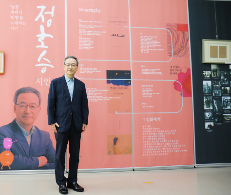 29일 오전 10시 서울 마포구 상암동 푸르메재단 넥슨어린이재활병원에서 열린 ‘푸르메를 사랑한 작가초대전’에서 정호승(66) 시인이 자신의 사진이 걸린 전시회 벽 앞에 포즈를 취하고 서 있다. (사진=푸르메재단)