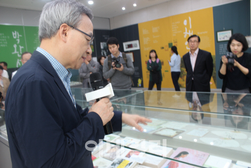 정호승 시인이 29일 오전 서울 마포구 상암동 푸르메재단 넥슨어린이재활병원에서 열린 ‘푸르메를 사랑한 작가 초대전’에서 전시 공간에 마련된 자신의 애장품들과 육필 원고 진열대 앞에 서서 전시품들에 대한 설명을 하고 있다. (사진=김보영 기자)